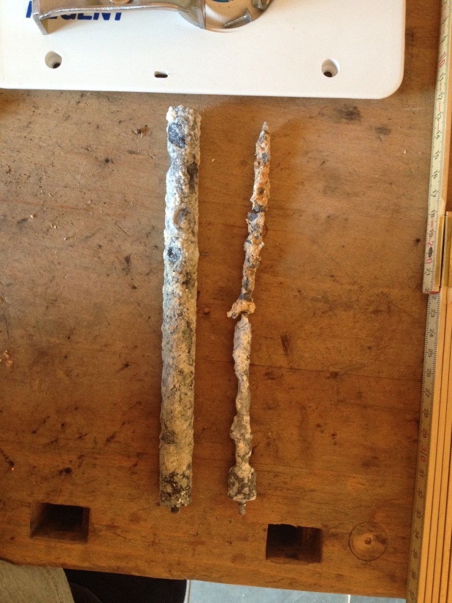 Published 21. November 2018 at 1067 × 1423 Zwei unterschiedlich verbrauchte Anoden. Linke nach Entkalkung noch brauchbar, rechte in drei Teile zerbrochen, verbraucht, muss ersetzt werden.