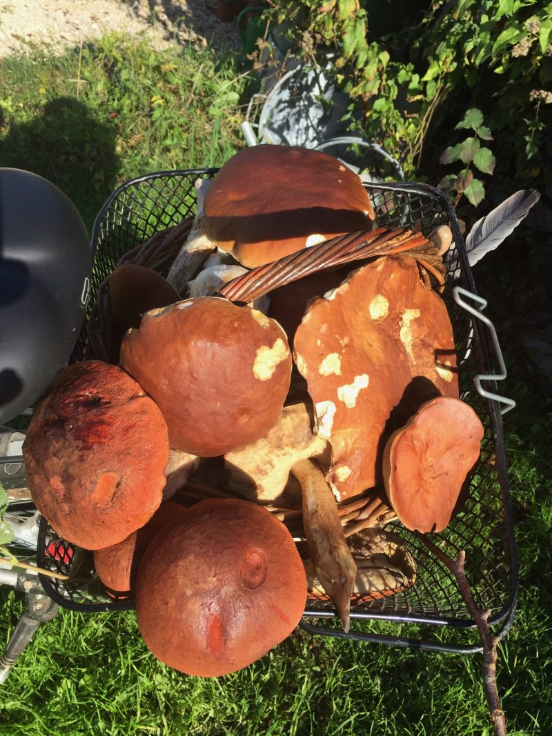 Evas Pilzchörbli auf dem Fahrrad quillt über.