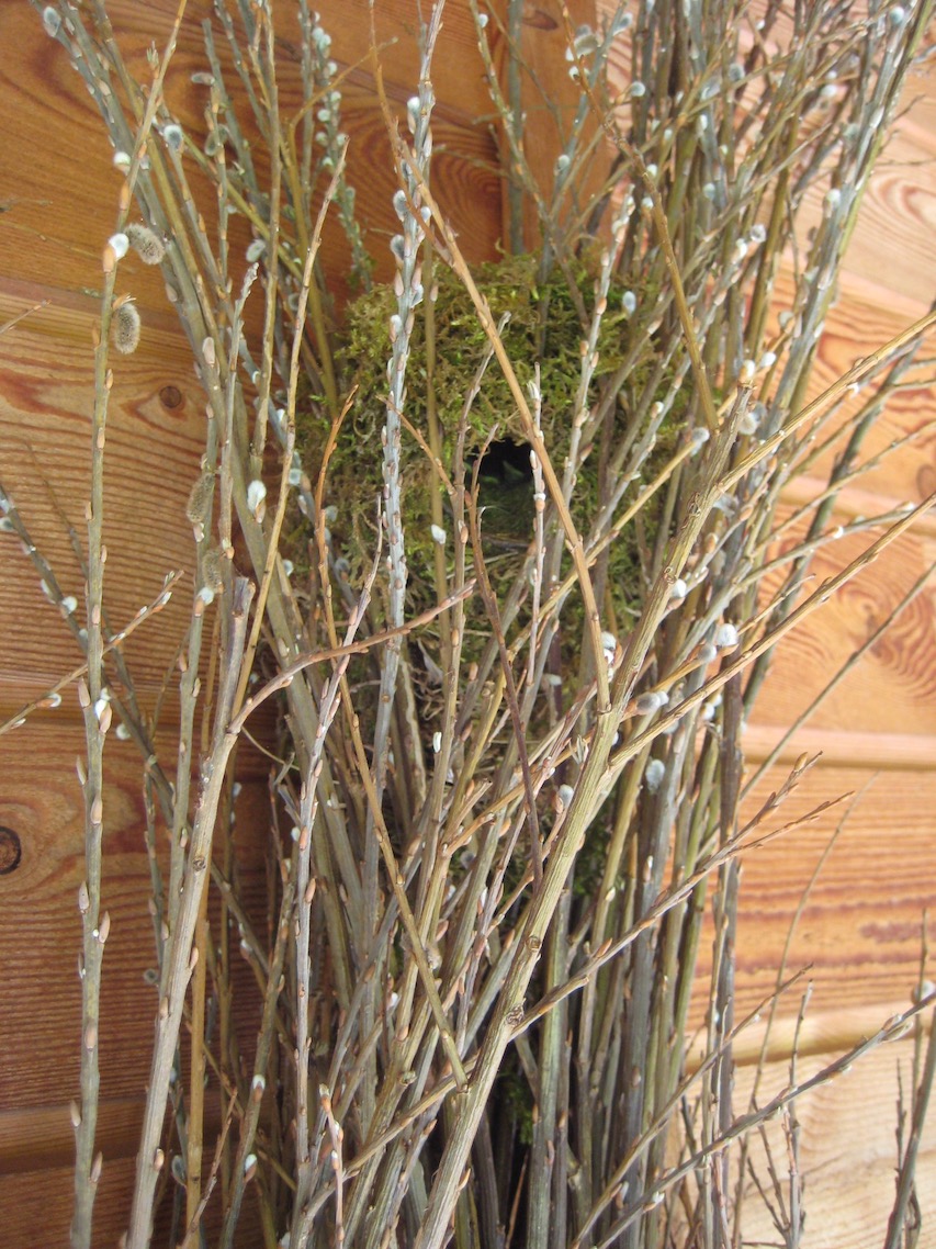 Das Nest aus Moos gebaut in den Weidenzweigent