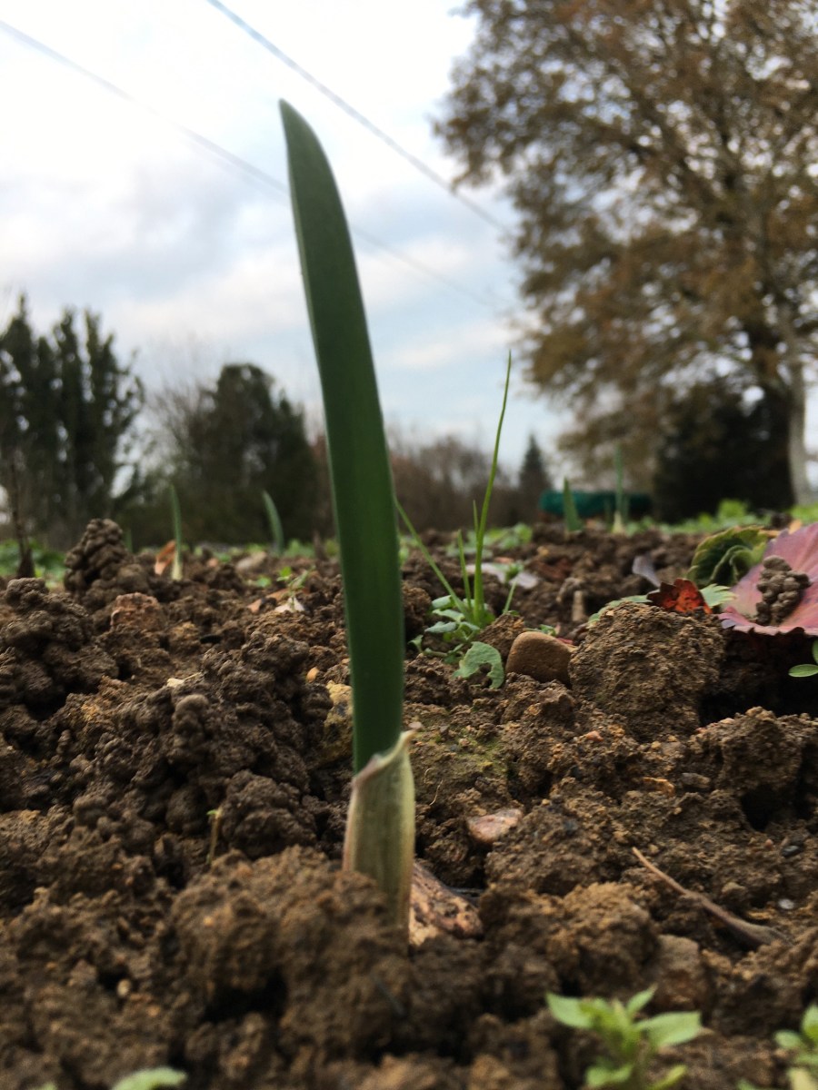 Auch der Knoblauch spriesst zwischen den Erdbeeren. Anfang …