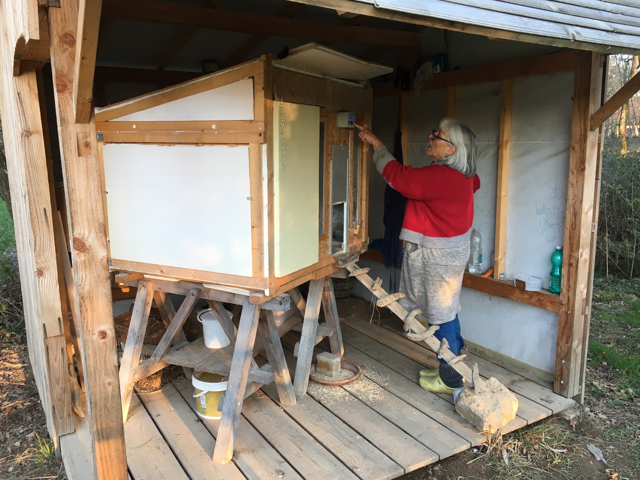 Published 8. Januar 2021 at 2240 × 1680 Eva stellt die Uhrzeit beim Hühnertörli neu ein, die Winterisolation deckt den Grossteil des Häuschens